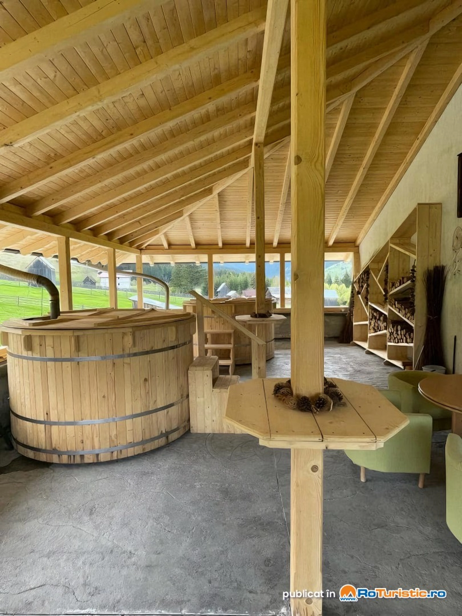 La exterior, aveți la dispoziție o curte amenajată cu o parcare privată supravegheată, 2 terase care au în componență: 2 ciubăre amplasate strategic, leagăne cu baldachin și saună.